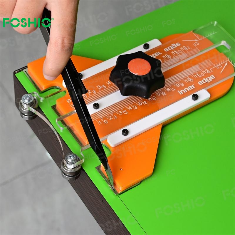 Als Reaktion darauf haben wir den Kanten-Schlupfschneider mit Doppelfunktion entwickelt: Er ermöglicht das Schneiden entlang der Innenkante eines Rahmens oder entlang einer Plattenkante. Dieser Kanten-Schlupfschneider eignet sich auch hervorragend zum Bekleben von Möbeln, beispielsweise von Tischplatten.